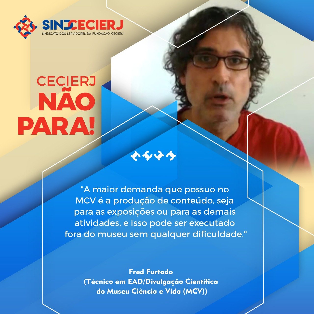 “Sou Fred Furtado, técnico em EAD/Divulgação Científica lotado no Museu Ciência e Vida (MCV), em Duque de Caxias. Eu e meus colegas sempre defendemos o home office como solução perfeita para os variados problemas que enfrentamos no MCV, como interrupção do abastecimento de água ou do serviço de internet, ausência das equipes de limpeza e de segurança etc. Infelizmente, sempre houve grande resistência a essa opção, sendo dito abertamente que home office não deve ser feito.