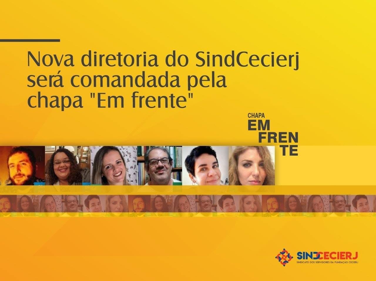 No dia 26 de junho, a chapa “Em frente” foi eleita com mais de 98% dos votos válidos com mandato para o biênio (2020-2022). A nova diretoria do SindCecierj agradece o apoio de toda a base e se compromete a manter a defesa dos interesses dos servidores da Fundação Cecierj bem como trabalhar para valorização da Instituição como essencial na política educacional e na divulgação cientifica no Estado do Rio de Janeiro.